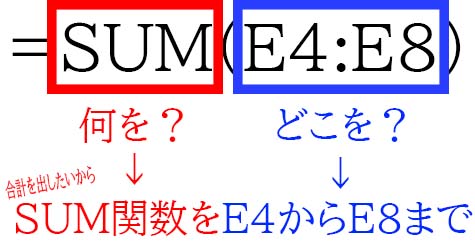 上記の画面から合計を算出する方が多いと思いますがこの方法だと選択してドラッグするだけで算出出来てしまうのでSUM関数の何がどうなっているかの仕組みがわからないんです。