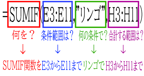=SUMIF(範囲, 検索条件, 合計範囲)