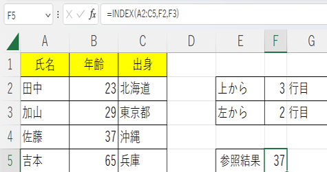 A2からC5の範囲で上から3行目、左から2行目の値を求めたい場合