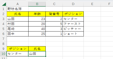 先ほど、ご紹介した野球名簿でポジションを入力すると氏名を参照するといった