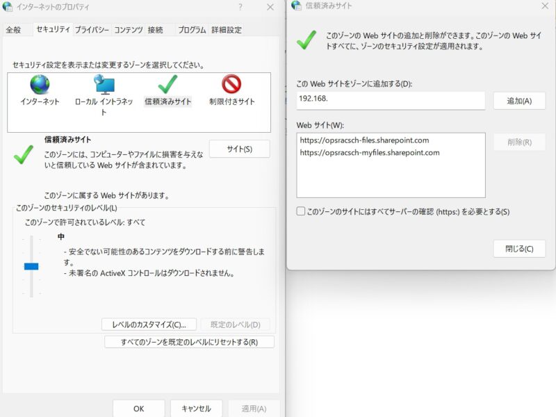 - 「このゾーンのサイトにはすべてサーバーの確認(https:)を必要とする(S)」のチェックを外す